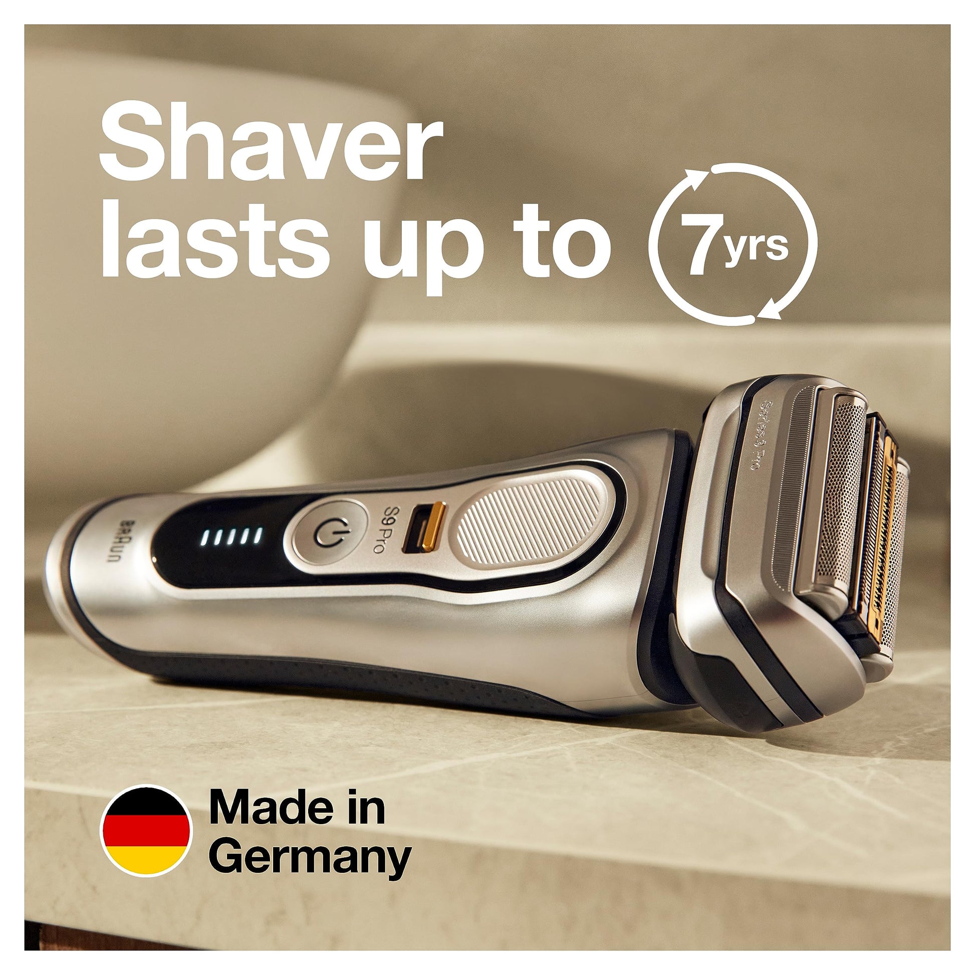 Details: Braun Series 9 Pro is the world’s most efficient electric shaver, reinvented to be even better. This wet and dry foil shaver provides you with both a close and gentle shave, no matter if it's a 1, 3, or 7-day beard. The ProLift trimmer captures and cuts flat lying hair, combined with our unique Sonic Technology to help shave up to 10% faster* for a more gentle shave in fewer strokes. Braun's AutoSense technology reads and adapts to your beard, providing a close shave even on dense beards. For unparalleled precision and control, this face and beard shaver features a redesigned precision switch to lock the shaver's head and easily capture tricky hair in those hard-to-reach areas like under the jawline and nose. A precision beard trimmer slides out of the back of the electric razor for easy and more accurate sideburn shaping. You can now shave cordlessly for longer (60 minutes) with 20% more battery than the previous Series 9. Braun Series 9 Pro 9487cc comes with a Clean & Charge station that cleans, lubricates, dries and charges your electric shaver at the touch of a button, and a ProCare Head that helps infuse any moisturizer or skin care deeper into the skin. Each shaving kit includes a Smart Plug charger for automatic 100 to 240 voltage adjustment. All Series 9 electric razors for men are made in Germany with premium craftsmanship.