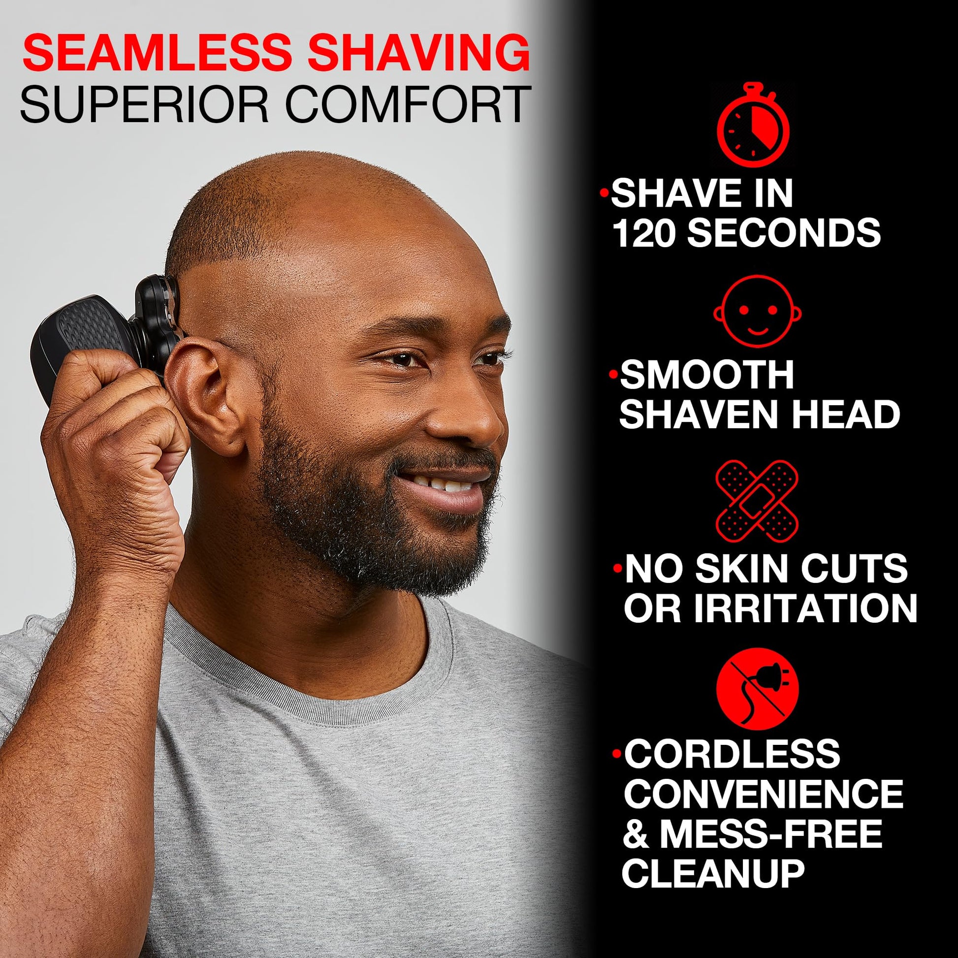 Details: Experience the ultimate in head shaving with the Remington Balder Boss, a cordless marvel designed for those who demand speed, precision, and comfort. With 66% more cutting heads, it offers a remarkably close and irritation-free shave, giving you a close-cropped look like never before. The 360-degree pivoting neck and flexing head adapt to your head's contours, allowing you to achieve a seamless, ultra-close shave in under 90 seconds. Crafted with Japanese-grade steel blades, it ensures consistent, smooth results, while the Turbo Mode effortlessly tackles even the thickest hair. Cleanup is a breeze thanks to the high-capacity hair chamber, and its waterproof design allows for wet or dry shaving. The added pop-up trimmer lets you perfect the finer details of your style. With a non-slip grip and an LED battery fuel gauge, you're always in control. This head shaver also comes with essential accessories, including a protective head guard, a cleaning brush, and an oil bottle. It's designed for the world traveler, with worldwide voltage compatibility and USB rechargeability. Plus, the extended 60-minute run time ensures you're always prepared. Backed by a 5-year limited warranty, the Remington Balder Boss is your ticket to the smoothest, most precise head shave imaginable. Elevate your grooming routine, shave with confidence, and choose the Balder Boss.