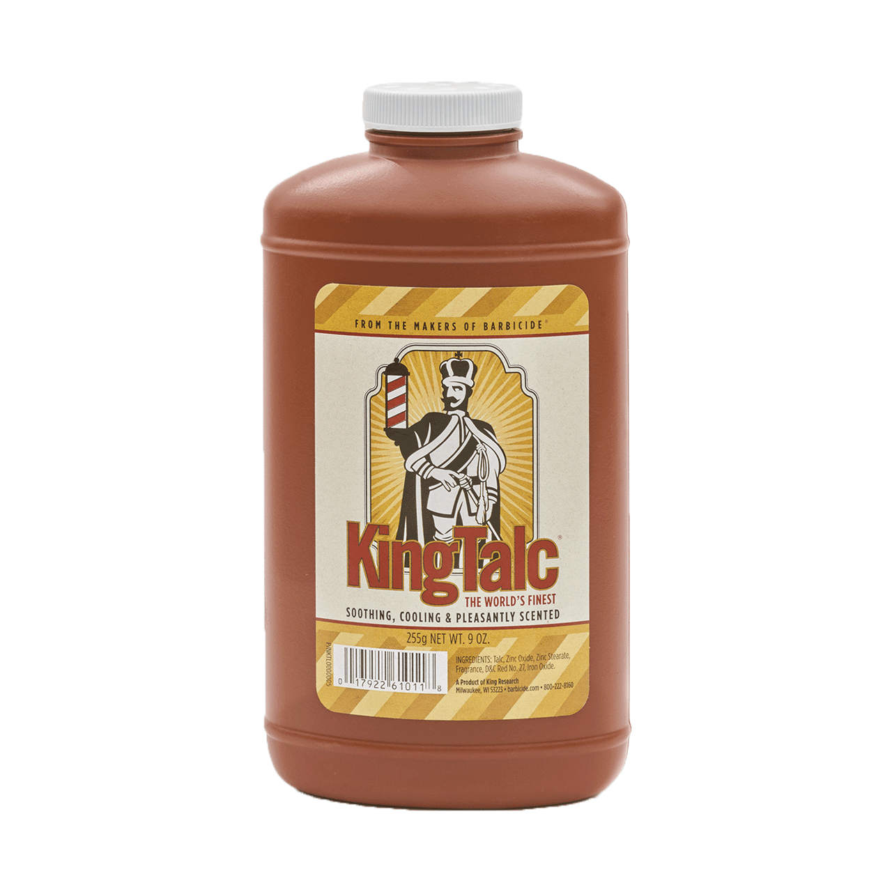 King Talc est une poudre de talc naturelle légèrement parfumée qui apaise et réconforte la peau sensible après le rasage.