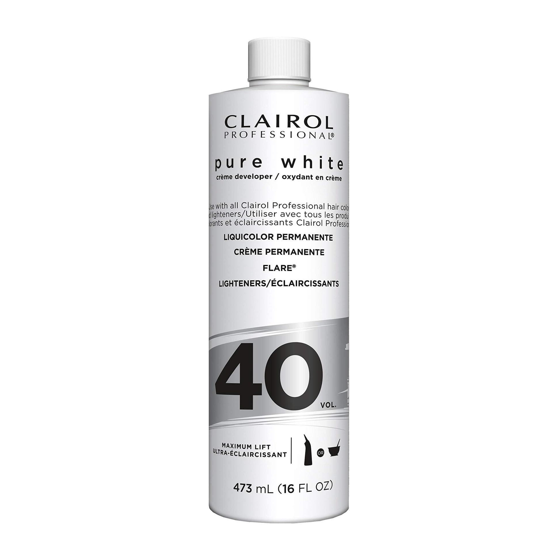 Crème révélatrice Clairol Soy 4Plex Pure White 40 VOLUME 473 ml - HC-04916. La crème révélatrice Clairol Professional Pure White contient des agents revitalisants et émollients protecteurs et est stabilisée 3 ans. Conçue pour les colorations permanentes, elle est également parfaite pour tous les éclaircissants en poudre et liquides. Sa consistance crémeuse est idéale pour une application au bol et au pinceau ou au flacon. CARACTÉRISTIQUES : Sa consistance crémeuse facilite l'étalement. Stabilise pour des résultats plus uniformes et prévisibles. Pour un éclaircissement maximal en une seule étape. FORMAT : 473 ml.