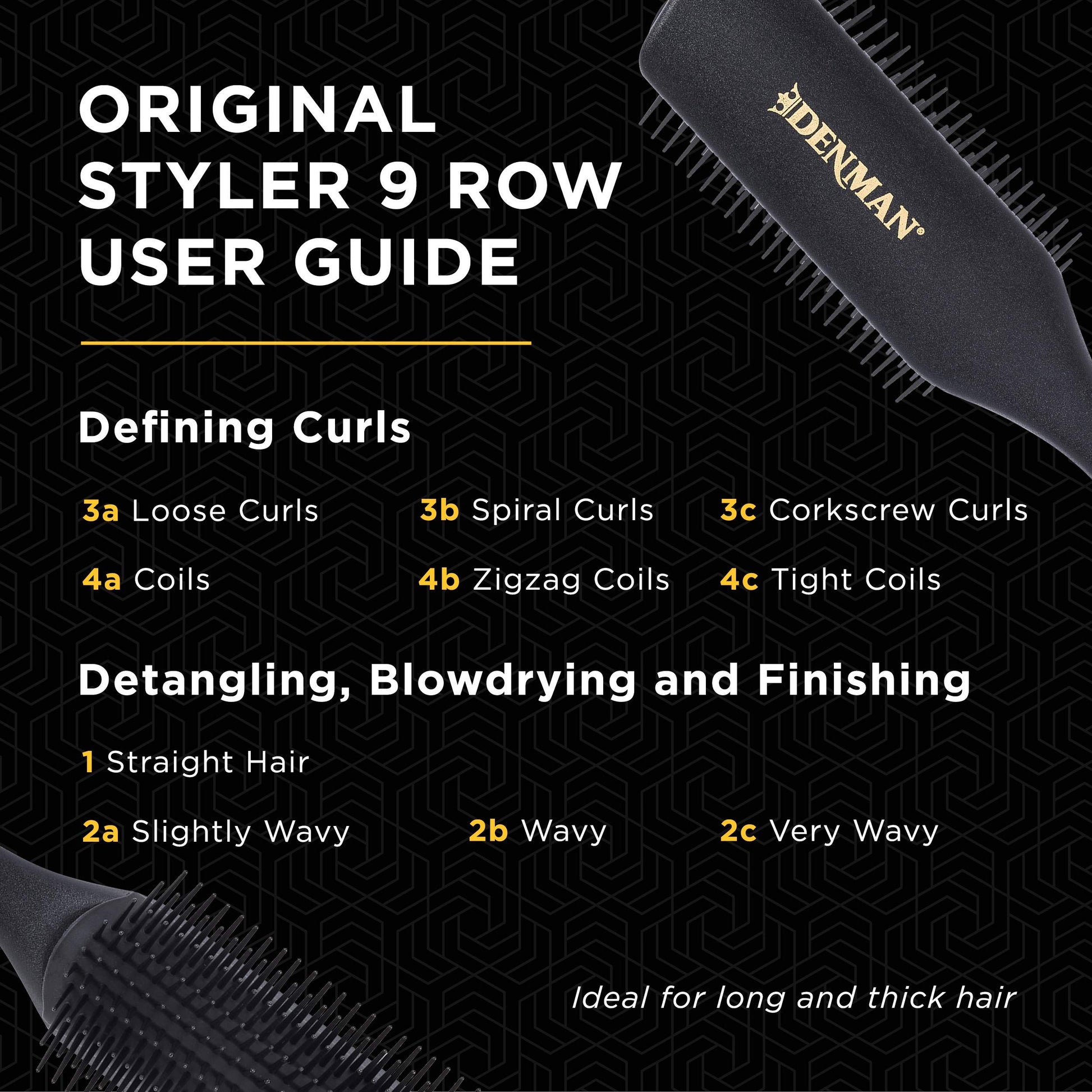 Brosse à cheveux bouclés Denman D4 (noire) à 9 rangs pour coiffer, lisser les cheveux longs et définir les boucles – Pour femmes et hommes