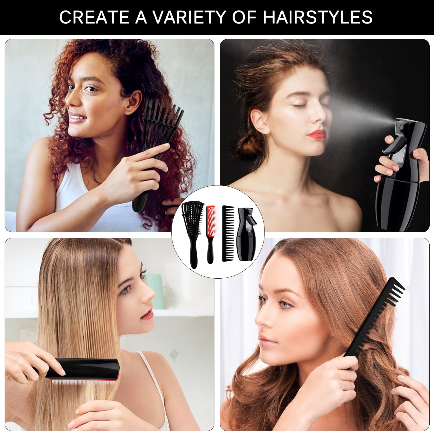4pcs Curly Hair Brush Set for Adult & Kids, Wet or Dry, Detangling with Spray Bottle, Wide Tooth Comb (3+1, Red)