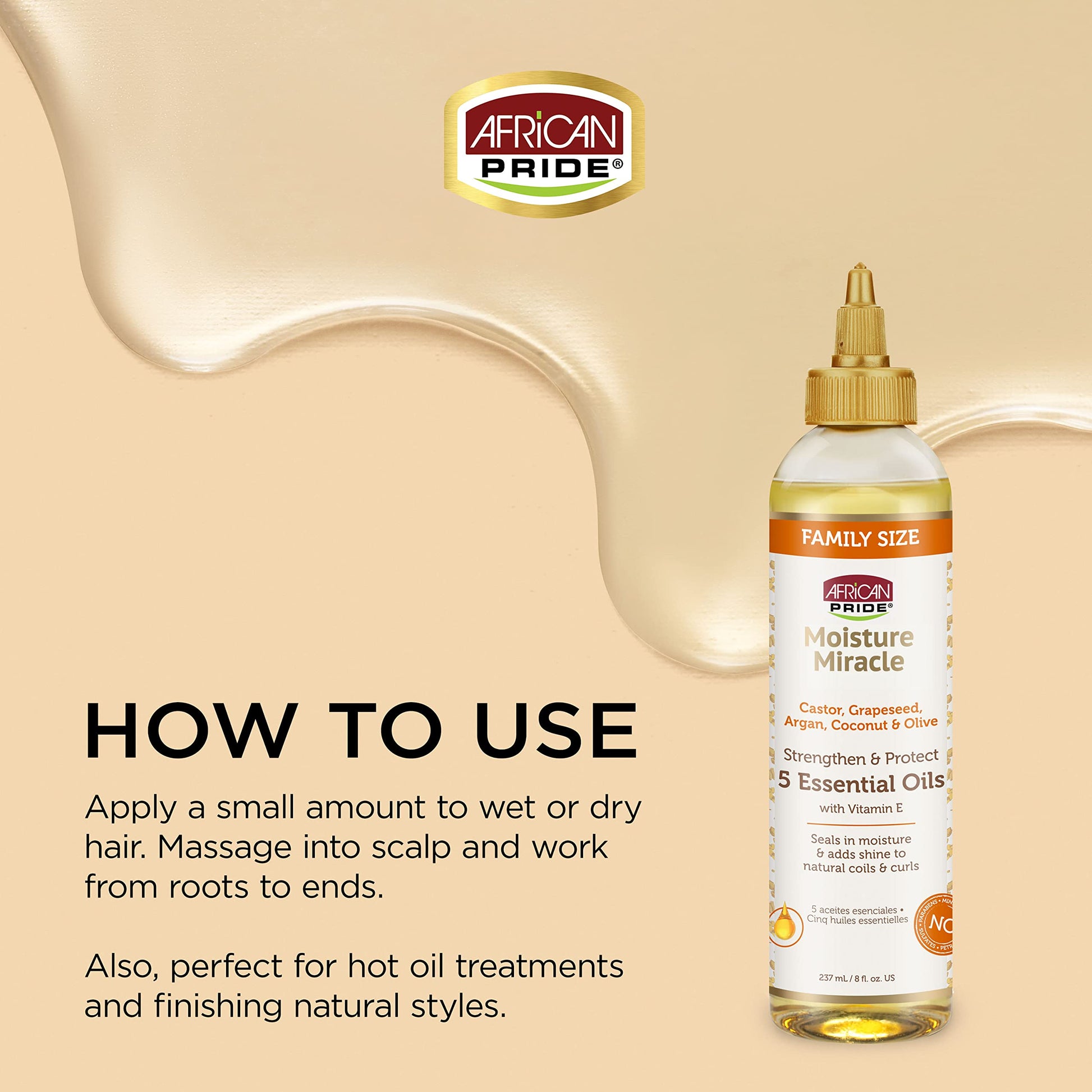 African Pride Moisture Miracle 5 Essential Hair Oils - Contains Castor, Grapeseed, Argan, Coconut & Olive Oil, Seals in Moisture & Adds Shine to Hair, Vitamin E, 8 oz