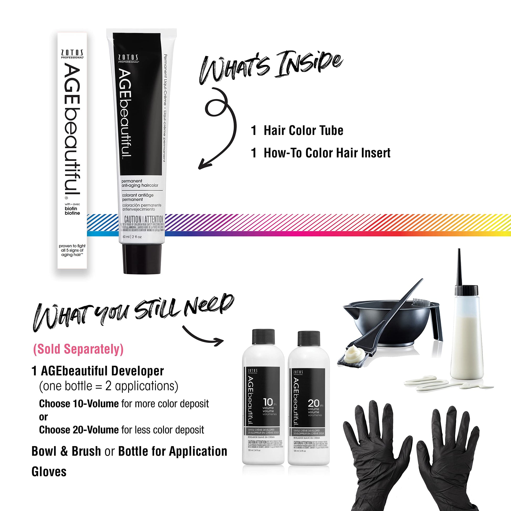 AGEbeautiful was specifically designed for mature hair (35 years or older) experiencing any of the 5 signs of aging hair, but it will provide rich, natural-looking color to all hair types and age groups. Now with Biotin, our professional hair color formula helps to nourish and fortify the fibers for fuller, thicker and healthier looking hair. Our professional hair dye formulas offer better gray coverage than boxed color. Plus, our unique anti-aging formula with melanin, keratin peptides, and silk proteins replenishes the hair with essential components that are lost with aging. Hair feels instantly fuller, silkier, and radiates with dimensional shine. Our new AGEbeautiful anti-aging hair color still replenishes hair with the essential components that are lost with aging and provides 100% gray coverage with rich dimensional color. Zotos Professional does not use animal tests to confirm the safety of Zotos Professional products. Safety of Zotos Professional products is assured by using safe raw materials and where applicable, confirming safety by testing via patch tests with human volunteers under a physician’s supervision and using non-animal alternative tests. We exhaustively test our products so we can ensure they meet our rigorous standards and back them up with proven claims. PROVEN TO FIGHT ALL 5 SIGNS OF AGING HAIR*: *According to Quantitative and Qualitative Testing: Zotos Professional Labs, Consumer & Professional Concept/Product Tests, Consumer & Professional Attitude & Usage Tests (Dec 2022).