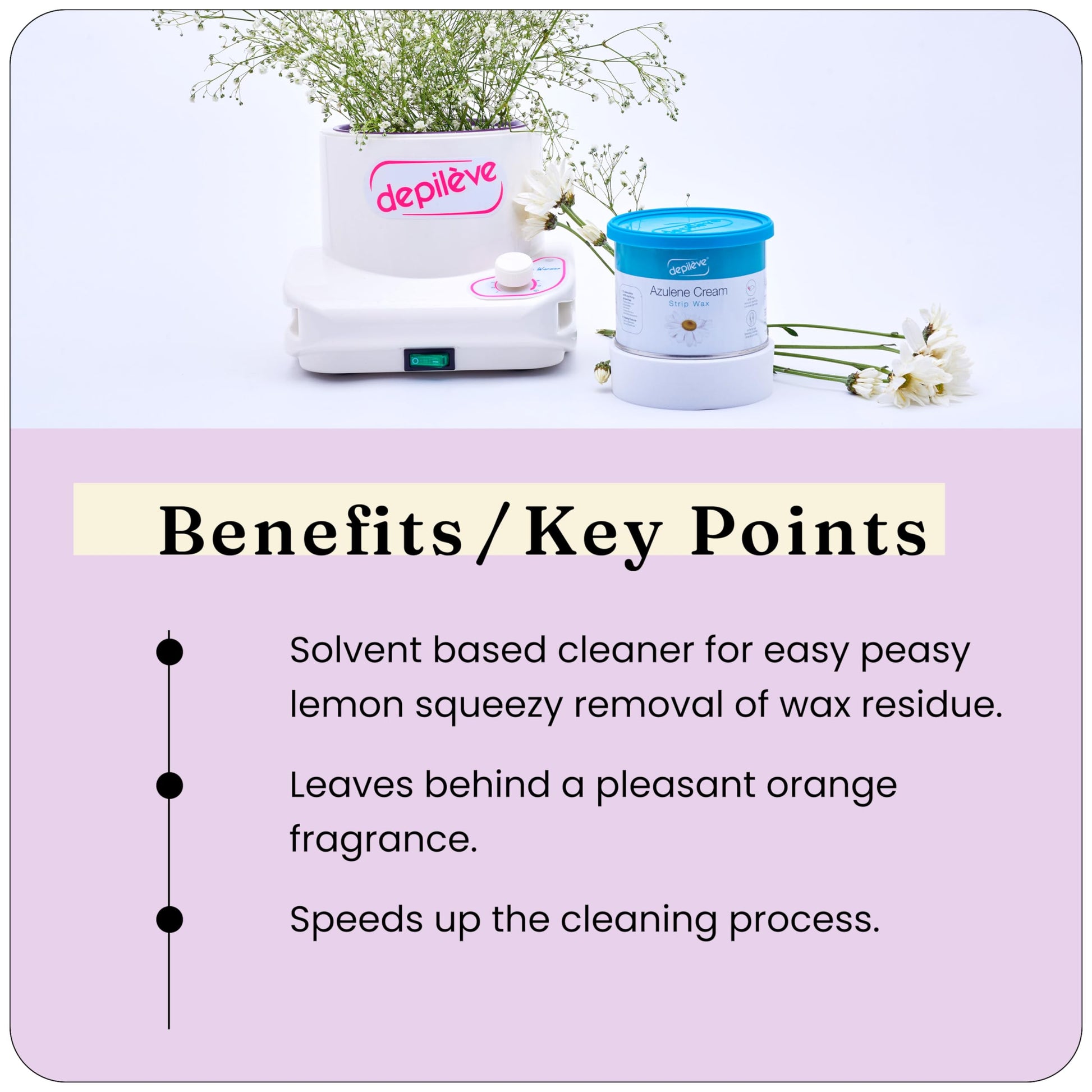Details: Quickly and easily clean up wax warmers, table or floor surfaces, or wax spilled on to clothing with Depileve Easy Clean. This citrus based remover won't stain equipment or clothing and requires no rinsing.