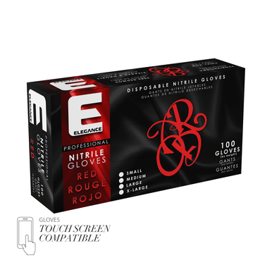 The Elegance Professional Red Nitrile gloves are perfect for hair styling, hair cutting, coloring, perming and all your hair and beauty needs. Gloves are made out of a synthetic rubber, and are an ideal alternative when latex allergies are of concern. Nitrile gloves are the superior glove when it comes to puncture resistance. This professional gloves provide great flexibility and mobility.Size Large. Box contains 100 gloves.