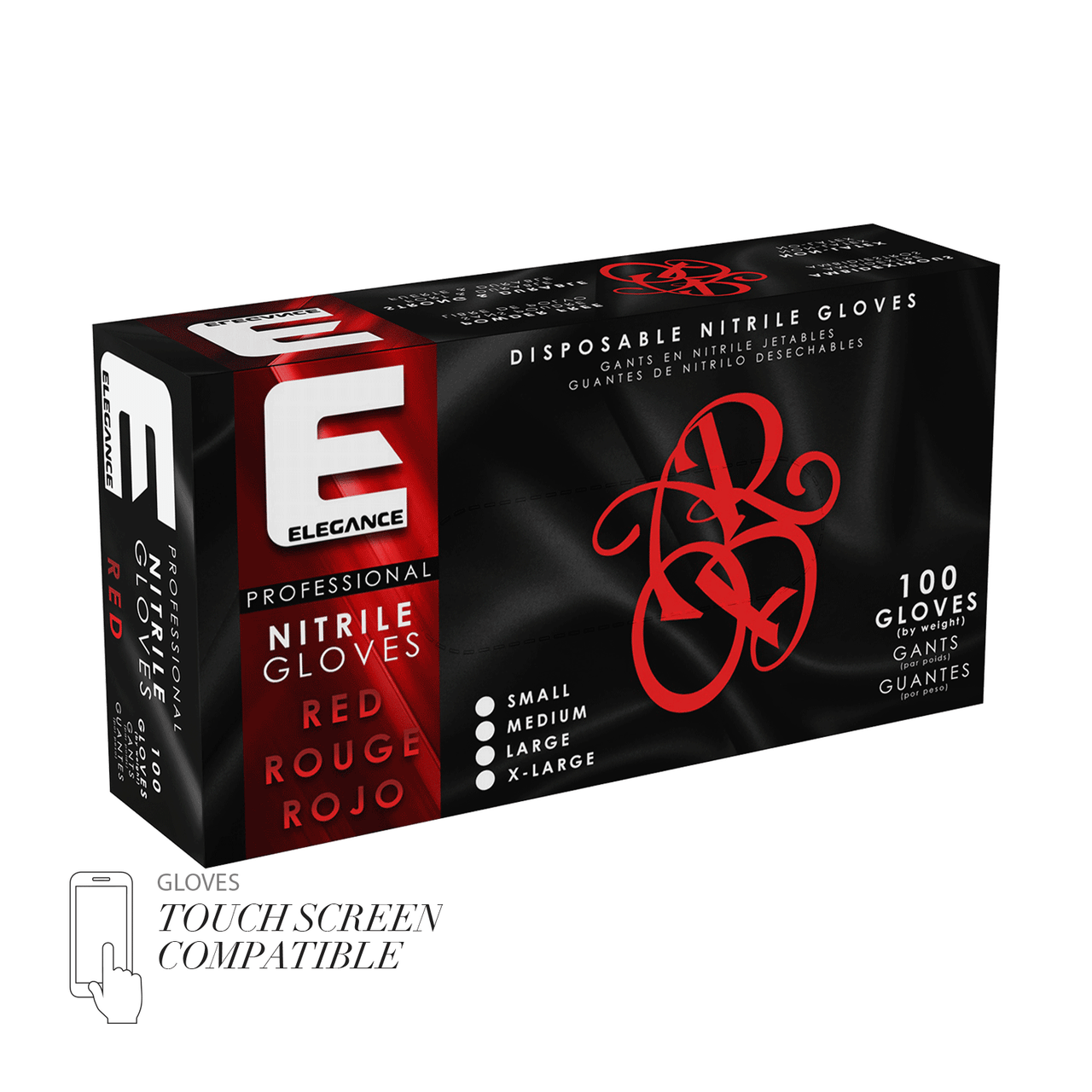 The Elegance Professional Red Nitrile gloves are perfect for hair styling, hair cutting, coloring, perming and all your hair and beauty needs. Gloves are made out of a synthetic rubber, and are an ideal alternative when latex allergies are of concern. Nitrile gloves are the superior glove when it comes to puncture resistance. This professional gloves provide great flexibility and mobility.Size Large. Box contains 100 gloves.