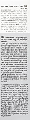 Details: Eye Serum with Vitamin C, enriched with green tea and chamomile. A newly developed eye serum designed for the intensive care of fine lines, dryness, puffiness and dark shadows around the eyes. The innovative synergetic compound combines high levels of Vitamin C with unique therapeutic Dead Sea minerals and essence of chamomile and viola to enhance the elasticity of the delicate skin of the eye area. Enriched with essence of green tea for long-term skin care and protection.