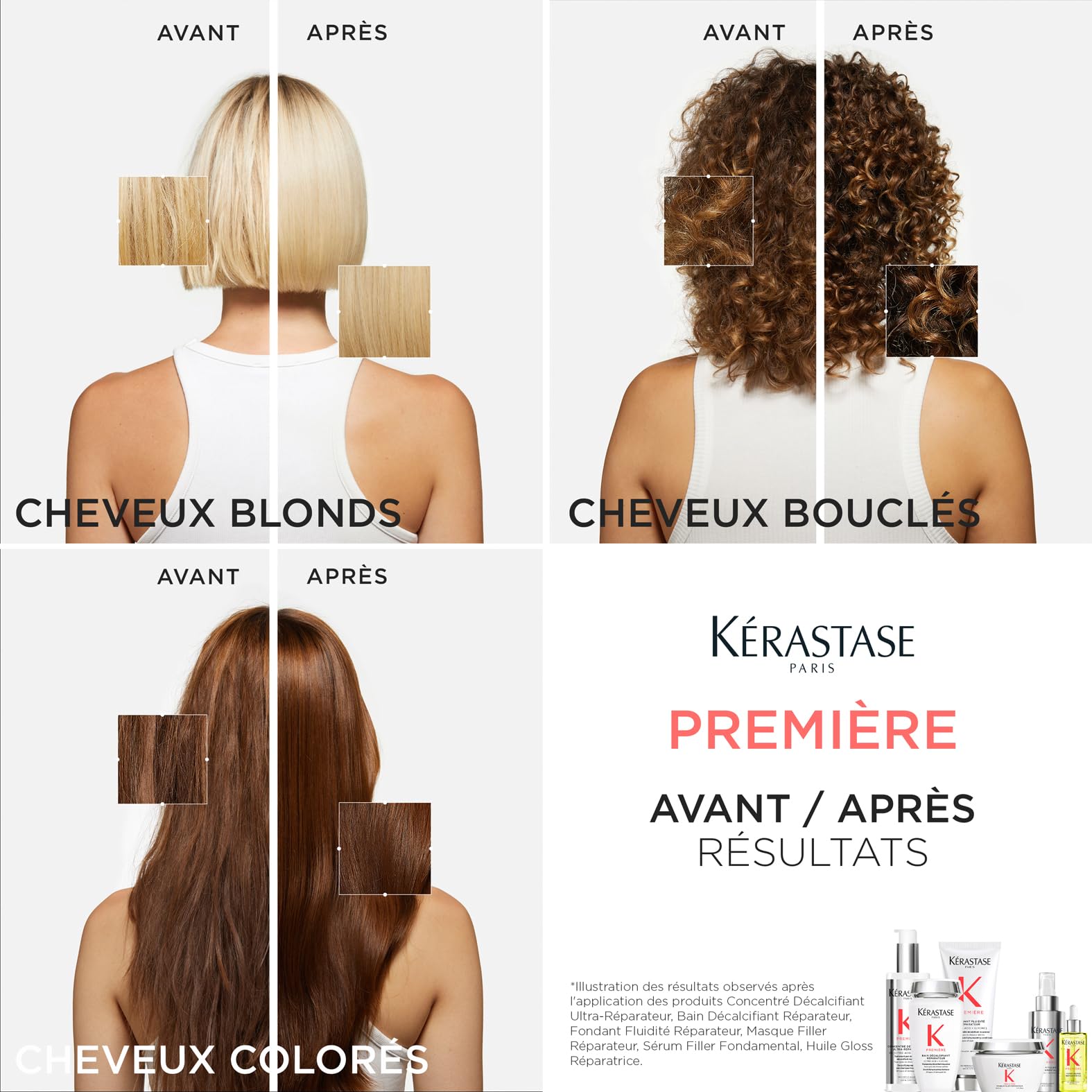 Alors que chaque femme et chaque homme aspire à une chevelure d'exception, chaque besoin capillaire est unique et nécessite une approche sur-mesure. C'est pourquoi, Kérastase crée des produits innovants et propose des routines personnalisées afin de garantir les meilleurs résultats. Ainsi, nous nous engageons à offrir des solutions capillaires professionnelles, hautement performantes, qui répondent aux besoins uniques de chacun, pour que chaque individu puisse exprimer sa beauté en toute confiance. La gamme Première Kérastase redéfinit l'excellence en matière de soin capillaire, offrant une approche globale et innovante de la réparation des cheveux abîmés. En éliminant l'excès de calcium, cette gamme à la pointe restaure 99% de la force originelle des cheveux, et reconstruit les ponts internes de la fibre capillaire pour une réparation profonde. Les résultats sont visibles et durables, vous permettant de retrouver des cheveux forts, lisses et éclatants, tout en les protégeant contre les dommages futurs. Le Masque Filler Réparateur dépasse les attentes d'un simple masque capillaire. Il offre une réparation profonde et intensive, comblant les brèches et réduisant la casse pour des cheveux incroyablement forts et doux.