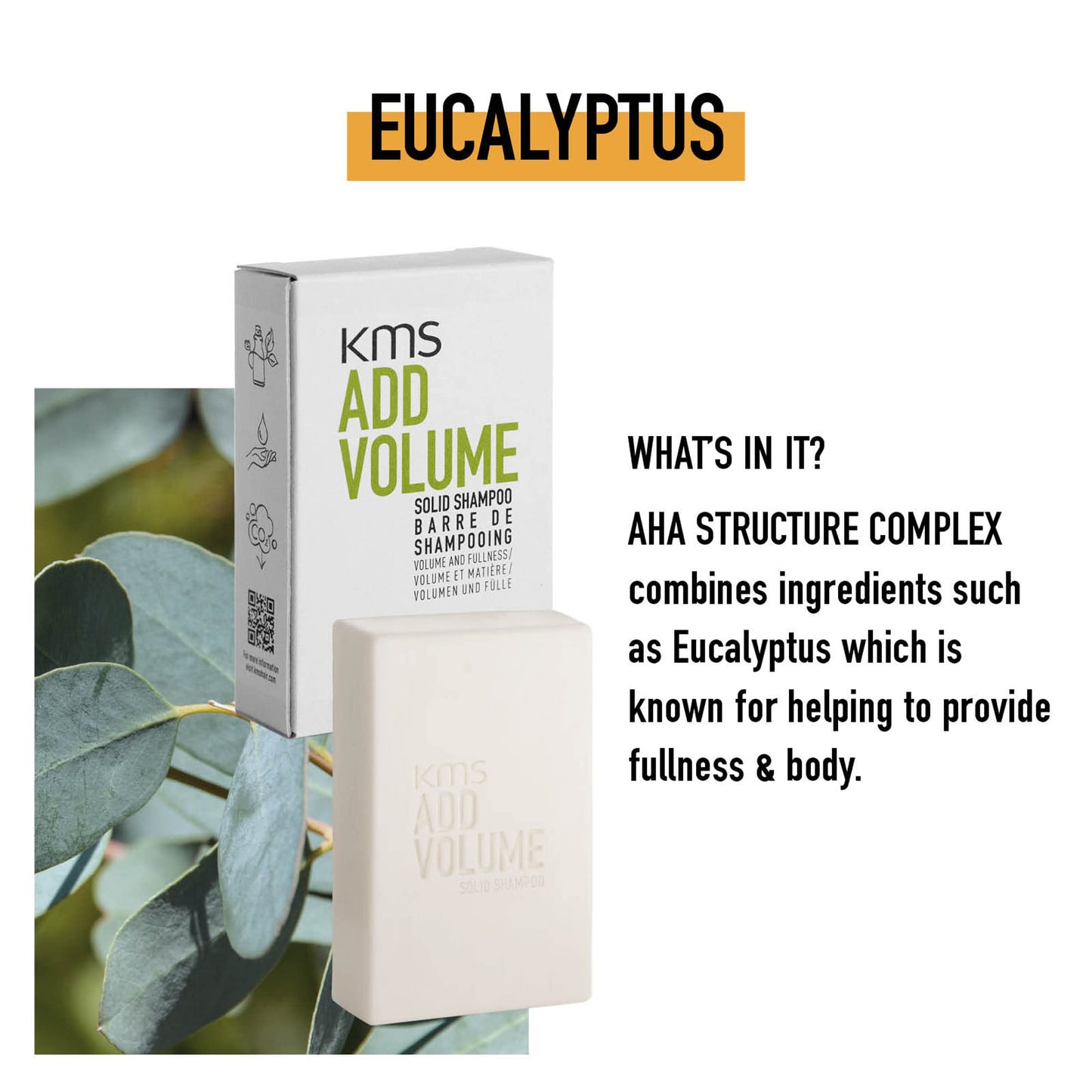 With 78% ingredients of natural origin, ADDVOLUME Solid Shampoo is supported by KMS TRIfinity Technology featuring AHA Structure Complex: improves both the internal and external structures of the hair to make it look and feel healthier while priming the hair for optimal style creation