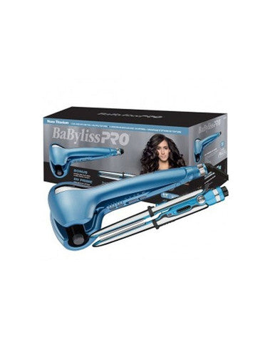 BaByliss PRO MiraCurl 3-in-1 Professional Curl Machine 3 curl sizes with one tool for multiple textures. Place section of hair in unit where you want curl to begin. Close handles, hair will be automatically drawn into the curl chamber. Hold until a steady beep signals curl is ready. Open to release the perfect curl.Tight defined curls the automatic tension control ensures the hair is wrapped securely around the slim barrel for effortless tight curls. Soft natural curls the automatic tension control ensures the hair is wrapped softly around the slim barrel then relaxed for defined, natural-looking curls. Loose relaxed waves the large barrel is automatically deployed and the hair carefully wraps around the barrel for beautiful loose curls.Babyliss PRO Mini Optima Flat Iron 3/4" Straighten, wave and curl with one tool. Aircraft-grade titanium provides exceptional heat transfer to instantly smooth strands and create shine. No-warp, curved stainless steel housing provides perfect plate alignment and no creasing.